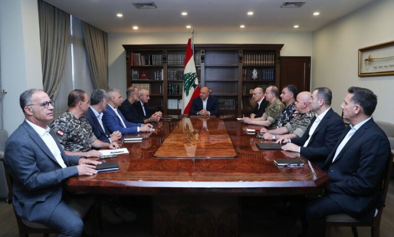 ترأس رئيس الجمهورية العماد جوزاف عون اليوم في قصر بعبدًا احتماعًا حضره وزير الدفاع الوطني اللواء ميشال منسى ووزير الداخلية والبلديات العميد احمد الحجار ووزير الاشغال العامة والنقل فايز رسامني، وقائد الجيش العماد رودولف هيكل والمدير العام لقوى الامن الداخلي اللواء رائد عبدالله والمدير العام للامن العام اللواء حسن شقير والمدير العام لأمن الدولة اللواء ادغار لاوندوس ونائبه العميد مرشد الحاج سليمان، ومدير المخابرات في الجيش العميد طوني قهوجي ورئيس شعبة المعلومات العميد محمود قبرصلي، ورئيس مكتب شؤون المعلومات في الامن العام العميد جوني الصيصا، والمستشار العسكري والأمني لرئيس الجمهورية العميد انطوان منصور.