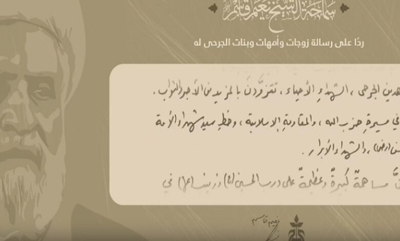 رسالة الأمين العام لحزب الله حجة الإسلام والمسلمين سماحة الشيخ نعيم قاسم رداً على رسالة لزوجات وأمهات وبنات الجرحى له