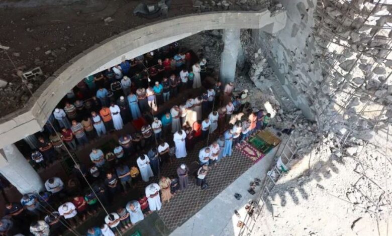 فلسطينيون يؤدون صلاة الجمعة فوق ركام “مسجد الألباني” في خان يونس