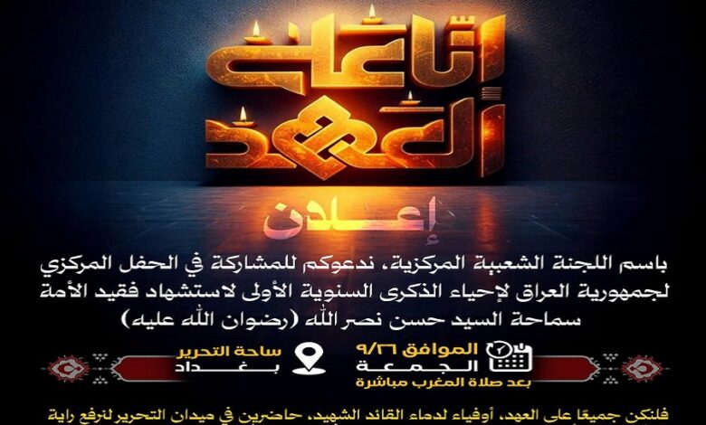 تحت شعار “إنا على العهد”، دعا الحشد الشعبي والعشائر العراقية، للمشاركة في احتفال مركزي سيقام في العاصمة العراقية بغداء إحياءً للذكرى السنوية الأولى لاستشهاد سيد شهداء الأمة وشهيدها الأسمى السيد حسن نصر الله.