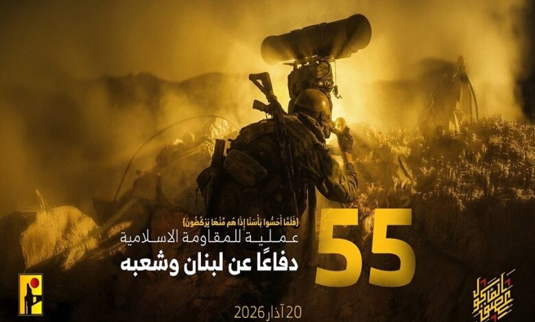 دفاعًا عن لبنان وشعبه، أصدرت المقاومة الإسلامية بتاريخ الجمعة 20/03/2026، 55 بيانًا عسكريًا حول عمليات التصدي لتحركات العدو الإسرائيلي عند الحدود اللبنانية الفلسطينية، وكذلك عمليات استهداف مواقع وقواعد وانتشار جيش العدو الإسرائيلي ومستوطناته في شمال فلسطين المحتلة، وفقًا للآتي: