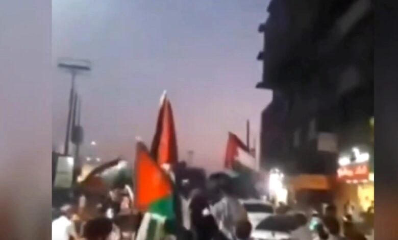 وأظهرت مقاطع فيديو تداولها ناشطون عبر منصات التواصل الاجتماعي عشرات المتظاهرين يجوبون شوارع حمص بالسيارات والدراجات النارية، ملوّحين بالأعلام الفلسطينية ومرددين هتافات مناهضة لـ”إسرائيل” وأخرى داعمة للشعب الفلسطيني.