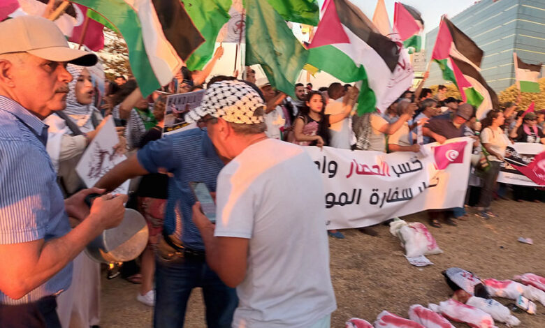 في مشهد استثنائي، لبت الجماهير الغفيرة نداء المقاومة، وشاركت في الاعتصام المفتوح أمام السفارة الأميركية في تونس بدعوة من تنسيقية العمل المشترك من أجل فلسطين، والشبكة التونسية للتصدي لمنظومة التطبيع، والرسالة الأهم من هذا الاعتصام هو فتح المعابر وكسر الحصار المفروض على أبناء الشعب الفلسطيني في غزة.