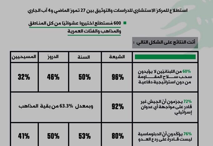 60% من اللبنانيّين لا يؤيدون سحب سلاح المقاومة